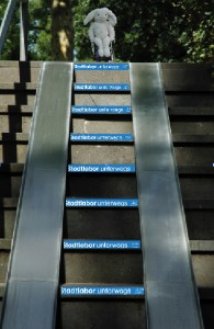 Der Hase wollte rechtzeitig zu Ostern wieder viele bunte Eier verteilen. Leider hatte er einen Unfall, dass er seitdem nicht laufen kann und heute im Rollstuhl sitzt. Nun fielen ihm die Rampe auf der Lili-Schönemann-Steige und an der Schwedlerbrücke auf. Er wundert sich, was diese denn für einen Sinn haben könnten. Egal, wen er fragte, keine/r wusste eine Antwort, was es mit diesen Rampen auf sich hat und viele meinten, wie er, diese sei doch bloß gefährlich und unnütz. Das Ostend-Projekt ist des Hasen große Chance! Vielleicht bekommt er ja auch noch nach Ostern eine Antwort.